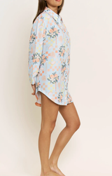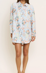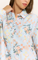 Comfy, polished and oh so versatile. Wear this brunch date sleep shirt as your comfy lounge look around the house, over a bathing suit as a cute coverup, or with white denim for an easy everyday look. Featuring a button up front, long oversized length, long sleeves, collared neck and a fresh citrus print.