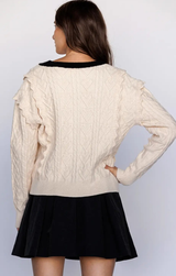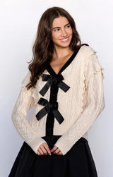Elevate your holiday looks with the best selling cardigan style. The Holly cable knit is a sweet and charming cardi style knit to dress up for your upcoming parties. Featuring cable knit detailing, v neckline, bow front and relaxed fit.