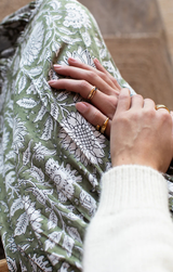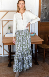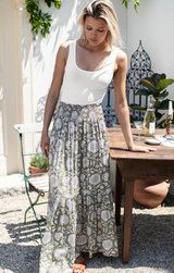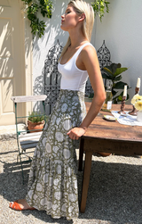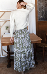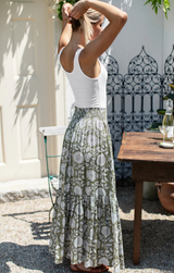 The Shirred Skirt is your breezy escape in fabric form. With its relaxed elastic waistband, flowing tiered maxi length, and Arles Gothic print over a soothing olive green, this is the piece you'll reach for when warm weather calls. Pack it for your next getaway or wear it now, either way, you're ready to unwind in style.