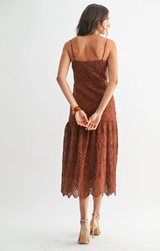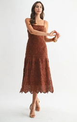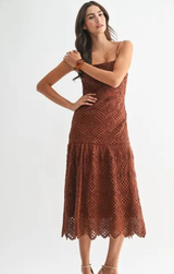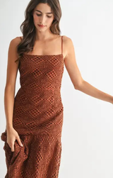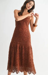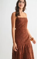 Effortlessly romantic, the Earthy Crochet Midi dress blends timeless craftsmanship with modern femininity. Featuring intricate open knit detailing and a flattering fit and flare silhouette, designed to highlight your shape while keeping a breezy, natural feel. Perfect for sunset dinners, garden parties, or any moment that calls for effortless beauty.
