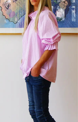 Introducing the Olive Shirt- the perfect combination of breathable cotton, a timeless silhouette, and a feminine feel. Featuring a functional button-front closure, oversized puffy sleeves, eye-catching frill detailing in the collar and sleeves, relaxed fit, and a unique 2 button cuff. Style with your denim of choice and chunky loafers for a polished spring look!