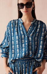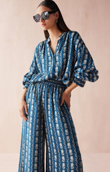 Effortlessly chic, comfortably roomy, and oh-so-polished! This unique blouse features billowed sleeves with wide cuffs with button and loop detailing, flattering pleating on the back, curved hem shape, and a full button-front closure. Style with the Paige Pant in Nico Indigo for a perfect pairing, or simply layer over your denim of choice.