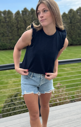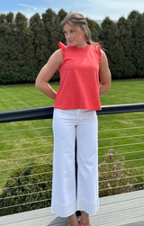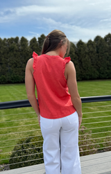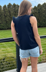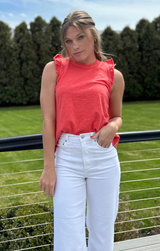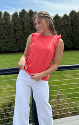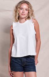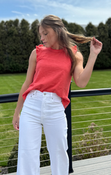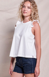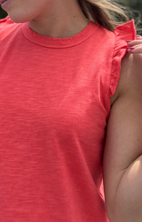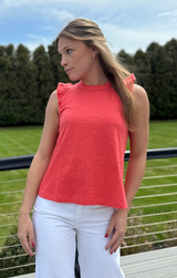 A closet basic with a feminine touch. Featuring a classic crew neckline, delicately ruffled sleeves with a raw finish for an edgy touch, relaxed fit, and length that ends just above the hip, all constructed in buttery 100% Cotton. Style with white jeans and gold jewelry for an easy yet eye-catching transitional look, or pair with the Pull On Pant in deep navy for a matching set!