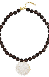 The Martha Flower Necklace is hand-knotted with freshwater pearls and accented by an hand-etched shell pendant, all finished with an 18k gold-plated sterling silver clasp.