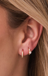 Delicate, dainty, and effortlessly chic. Designed for subtle sparkle and timeless elegance, these mini hoops hug the ear just right for a sleek, minimal look. Wear them solo for understated shine or stack them with your favorite studs or hoops for a curated stack.