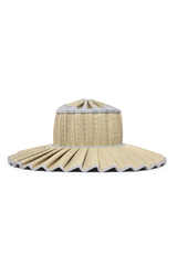 Everyday elegance, crafted for the sun. The Tropics Capri hat features periwinkle blue stripes with delicate black thread accents woven through natural grass fibers, all finsihed with a soft, grey-blue fabric trim.