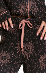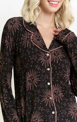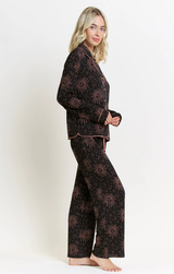 You might not want to take this cozy pajama set off! Featuring a notch collar button down top with long sleeves and a lightweight drawstring pant constructed in super soft jersey fabric, this set pairs perfectly with a cozy candle and a fireside book!