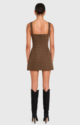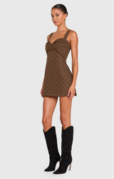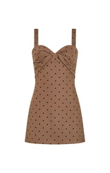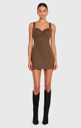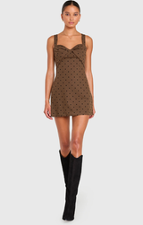 We are loving some playful polka dots for our fall vibe this season. Featuring a sweetheart neckline, fitted body, flared out mini skirt and hidden romper underneath. Style with strappy heels and gold jewelry for a polished party look.