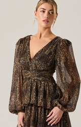 A flowy, feminine maxi dress with a flattering shape and edgy cutout design. Featuring a tiered flowy skirt, daring side slit, long blouson sleeves and statement print. Style with heels and a cute clutch for a fall wedding look.