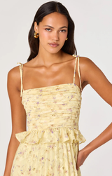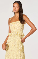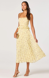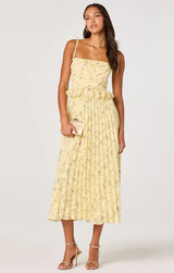 Twirl into spring with this charming midi dress that celebrates all things feminine. Delicate yellow florals dance across the fabric while pleated details and playful ruffles add dimension and movement. Adjustable tie straps let you customize the fit to your liking, making it as comfortable as it is gorgeous. Whether you're heading to brunch or a garden party, this dress strikes the perfect balance between sweet and sophisticated.