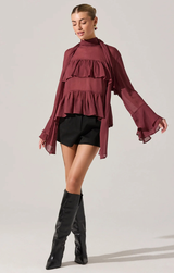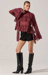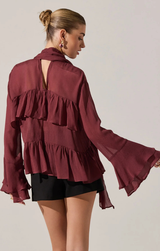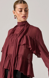 Major witchy vibes in this must have blouse for the new season. Featuring semi-sheer details, ruffles, scarf neck detail and bell sleeves in a rich wine color. Style with a suede mini skirt and boots.