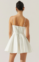 A sexy corset style midi featuring a flared out pleated skirt, thin straps, sweetheart neckline and a smocked back. This is the perfect bride-to-be dress for your summer wedding festivities. Style with statement heels and gold jewelry for a bachelorette weekend look.