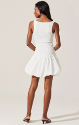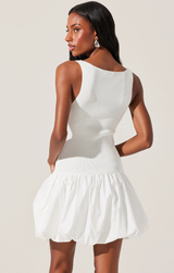 A chic ribbed knit sweater dress with elegant details. Featuring a fitted ribbed knit bodice, bubble style hem, sleeveless design, and bright white. Style with heels and gold jewelry.