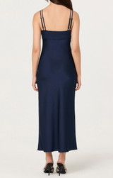 Navy is the new black. This sultry stunner features a sweetheart neckline with delicate lace detailing, a structural seam under the bust, spaghetti straps, midi length, and bias cut fabric that's designed to effortlessly drape the form. Pair with heels, gold jewelry, and a clutch for a timeless nighttime look.