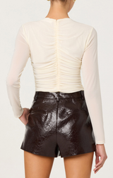 Elevate your holiday wardrobe with the Yasmine Top, a playful twist on festive elegance. This off-white beauty features charming ruched detailing throughout for a flattering silhouette, paired with a chic button keyhole at the front for that perfect peek-a-boo moment. A hidden back zipper keeps things seamless and sophisticated, while long sleeves provide cozy coverage. Whether you're heading to a party or a casual gathering, this soft, versatile piece is ready to steal the spotlight.