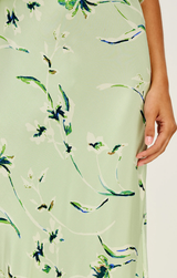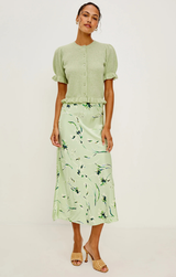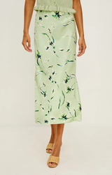 Spring has sprung in this dreamy Mint Linnea print Anya skirt. Featuring a high-rise, body-skimming bias-cut, midi length, lustrous satin-back crepe, with a concealed elastic waistband for a polished fit.