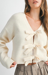 A best selling style back for another holiday season! Now in a soft cream color featuring, a 3 bow front, long drop sleeves, slightly cropped length and a v neckline. Style with a sweet mini skirt and boots! P.S. This can be worn with the bows in the back for a different style vibe!