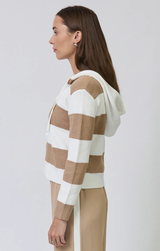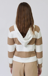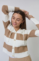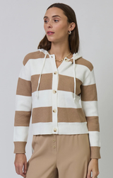 Layer up all year long in this versatile cardi! This soft ribbed knit features a button-front closure, cozy drawstring hood, long sleeves and a relaxed cropped silhouette that keeps things effortlessly chic, all finished in bold contrast stripes in an easy-to-style colorway.  Perfect for throwing on over your favorite tee or wearing closed as a top with wide leg denim!
