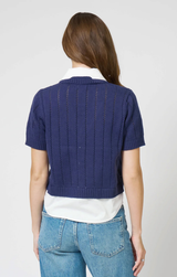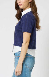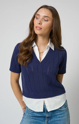 The Kendall Twofer delivers the best of both worlds. Featuring a classic V neckline with a collared detail for a twofer-style layered look, cropped fit, pointelle knit, and ribbed edges. Pairs beautifully with slacks and a blazer for a polished office-ready look, or dress it down with denim and sneakers.