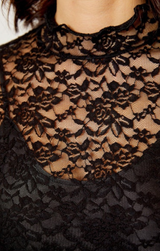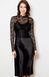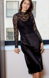 A sexy take on the classic black dress. Featuring a bold black sheer lace detailing on top and a silky smooth slip dress underneath. Style up with pointy black heels and a cute clutch for a party ready look.