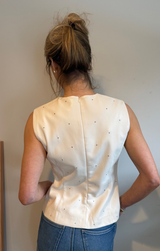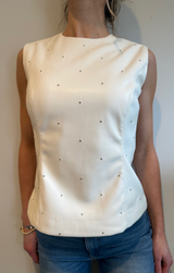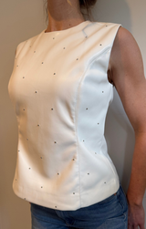 The edgy touch your closet's been dreaming of. This flattering top features a sleeveless design, a sleek crew neckline, tailored seams, and studded accents throughout to add a little texture. Pairs perfectly with trousers, skirts or denim.