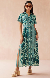 A updated version of the classic summer maxi dress by Omika. Featuring short sleeves, collared neckline, button up front, tie waist and the best selling print. Style with heels and a clutch for a party ready look.