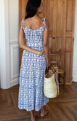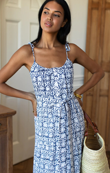 A perfect summer midi dress that easily transitions from day to night. Featuring a hand block printed, shirred scoop neck, button down front with slit, removable tie and an airy  fit. Style with slides and a cute clutch for an everyday vibe.