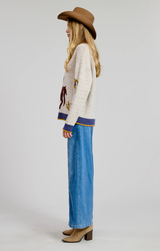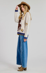 Saddle up for cozy adventures with the Prairie Ride Sweater. Featuring a playful western-inspired graphic, this sweater brings a fun "yeehaw" vibe to your fall wardrobe. Perfect for embracing your inner cowgirl. Style with classic wide leg denim, boots and a rancher hat.