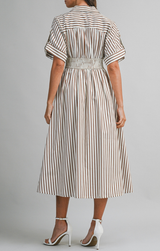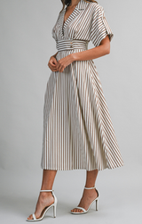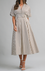 This darling midi is ready to be worn anytime, anywhere. Featuring a classic collared neckline with lapel, flattering A-line silhouette, midi length, and a cinched waist adorned with charming buttons, all finished with rich espresso-colored stripes. Pair with a blazer for the office or strappy heels for a night out!