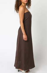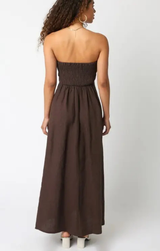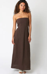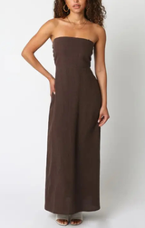 Turn heads in the Irise Linen Dress, a strapless stunner that's equal parts sophisticated and sexy. Crafted from soft, breathable linen in a rich brown hue, this dress hugs your curves with a fitted silhouette before flowing gracefully to maxi length. Perfect for date nights, summer soirées, or whenever you want to feel absolutely fabulous. Slip it on and let the compliments roll in.