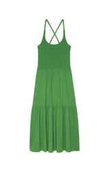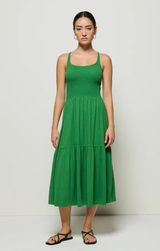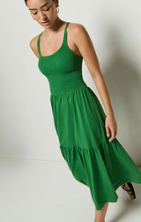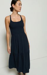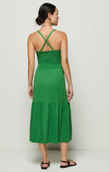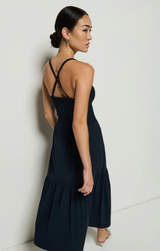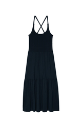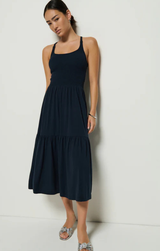 The dress that sold out 5 times is back for another season! A best selling, figure flattering midi to dress up or wear casually through the warm summer months. Featuring a soft ribbed fitted top, cross back details and a flowy midi length skirt. Style with sandals or sneakers and gold hoops.