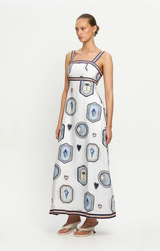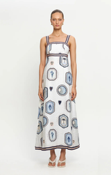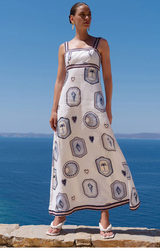 Set sail in this vintage-inspired linen maxi. The Alessia features coastal medallions, shell motifs and palm emblems in soft blue and sand tones, a classic square neckline with adjustable straps, and a softly fitted bodice and a relaxed skirt, all finished with contrast trim detailing throughout. Style with a sunhat and tie-up sandals for your next seaside getaway.