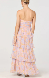 The Anisha Dress is a dreamy escape in soft orange and lavender hues. This strapless maxi features romantic tiered layers that dance with every step, ideal for vacation getaways and spring adventures. Effortlessly elegant and undeniably feminine, it's the perfect piece for those seeking understated sophistication with a touch of whimsy.