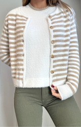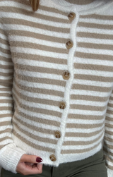 The Heidi Striped cardigan features a classic crew neckline with a full button front closure. Designed with timeless ivory and beige stripes, its finished with subtle ribbed detailing along the sleeves for added texture. An easy layering piece that feels polished and relaxed. Pair with the Heidi Crop Crew Sweater for a complete matching set.