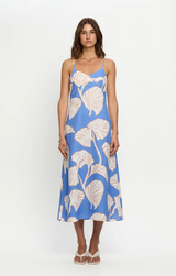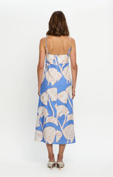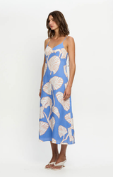 We're in love with Ilana this summer. Featuring a breezy relaxed silhouette, adjustable thin straps, a softly flared hem and an invisible centre-back zip, all finished with oversized ivory and blush leaf motifs on a bold sky-blue base. Style with gold jewelry and sunglasses for your next coastal getaway.