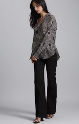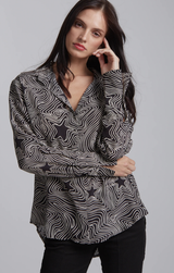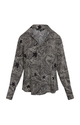 A clean cut, everyday staple to style endlessly during the cooler seasons. Made of a dreamy silk charmeuse and featuring a button up front, long sleeves, relaxed fit and bold Bowie inspired print. Style with everything from denim jeans and boots to black leggings and sneakers.