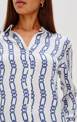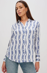 A perfect piece to take you into the cooler weather. Made from 100% silk charmeuse, this luxurious button up features a chic chain link pattern stripe, long sleeves, collared neck and a classic button front. Style with everyday denim and boots.