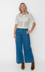 A feminine and playful touch on the classic cardi style. Featuring sheer knit details, quarter sleeves, button front, collared neck and a lightweight ivory fabric. Style with everyday denim jeans and boots.