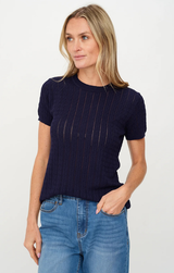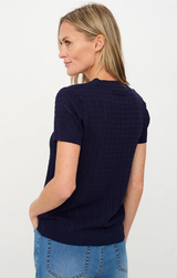 A classic cable knit mixed into a tee shirt like silhouette. This piece will take you right into the new season effortlessly. Featuring a short sleeve design, fitted body, cable knitting, crew neck and deep navy hue. Style with denim jeans and boots.