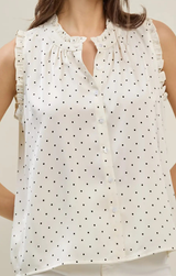 An airy satin blouson equal parts comfortable and flattering. Featuring a feminine ruffle trim, relaxed fit, button up front, polka dot pattern and a relaxed fit. Style with everything from a silky midi skirt, denim jeans or high rise trousers.