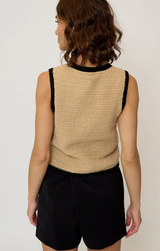 A timeless silhouette with textured details. Featuring a scallop front design, black trim, sleeveless style, gold tone buttons, and a luxurious cotton blend. Style with a chic mini skirt and boots for a fresh fall vibe.