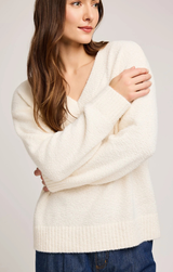 A cool weather knit you need for the new season. Made from a soft bouclé yarn, this v neck sweater features a ribbed cuffed hem, jersey pattern, oversize fit and a gentle cream color. Style with wide leg pants and sneakers for a laid back vibe.