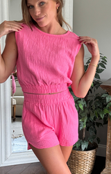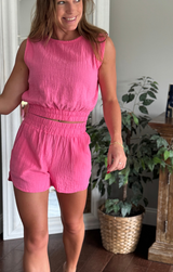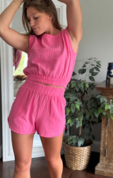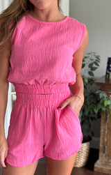 A warm weather classic so airy you might want to live in it. 100% cotton construction keeps you effortlessly cool in more ways than one. This gauzy crew neck tank is a summer basic that can be styled with almost any bottom, but pairs especially well with the Elastic Waist Pocket Short for an easy lightweight set. This breezy tank is perfect for taking on vacation with you!