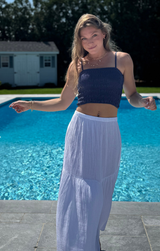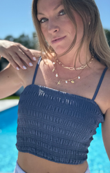 Charming, comfortable, and chic. This cropped top features slim straps, stretchy smocking, and a flattering fit that pairs effortlessly with the coordinating Smocked Skirt in Navy or denim shorts.