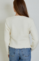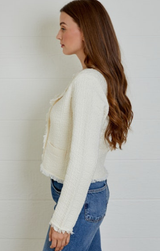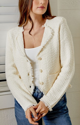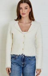 A classic cotton construction meets fashion-forward texture. The Giovanna Blazer features a classic lapel neckline, functional button-front closure, front pockets for your essentials, a fringe trim at the lapel and front opening, and shoulder pads to add a little structure. Layer over denim and a tee or create an office-ready look by pairing with slacks and a button-down.