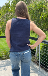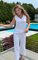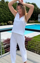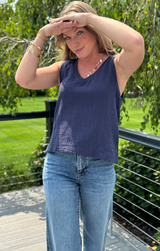 This lightweight tank is the perfect summer basic with a little added texture. Featuring a relaxed fit, classic V neckline, and length that ends just above the hip, all finished in breathable cotton gauze. Pair with the coordinating Smocked Waist Wide Leg Pant or simply style with your denim of choice.