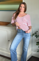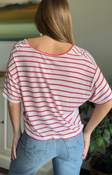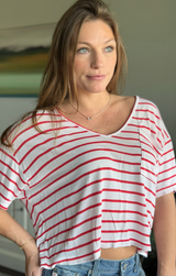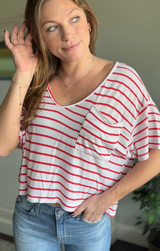 Stripes never go out of style! This super soft tee features a classic V neckline, slightly cropped length, a comfortable oversized fit, drop shoulder details, a front chest pocket to store your essentials, and a timeless contrast striped pattern. Style with denim shorts and a hat for an easy summer look, or pair with white jeans and strappy sandals for a more polished day-to-day ensemble.