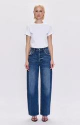 Pistola's signature bowed wide leg jean featuring an ultra high waist and a dark wash with a lived in look. Style with a fitted long sleeve and boots for a chic fall feel.