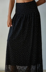 Shimmer and flow in this effortlessly chic black maxi skirt. Designed with a lightweight sheer overlay scattered with subtle sparkles, it catches the light beautifully with every step. The soft elastic waistband offers a comfortable fit, while the long, flowy silhouette makes it perfect for both day and night. Style it with a basic crop tee for a comfortable elevated look or with the matching Emily Beaded Sleeveless top for a matching set.