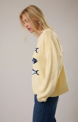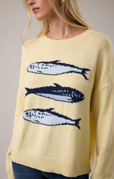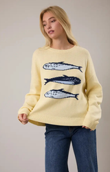 Coastal charm meets cozy comfort. This seaside-inspired sweater features a relaxed fit, crew neckline, long sleeves, graphic knitted sardines along the front, and ribbed detailing at the collar, cuffs, and hem. All finished in a breathable cotton blend, it's easy to style for spring with light wash jeans and gold jewelry!
